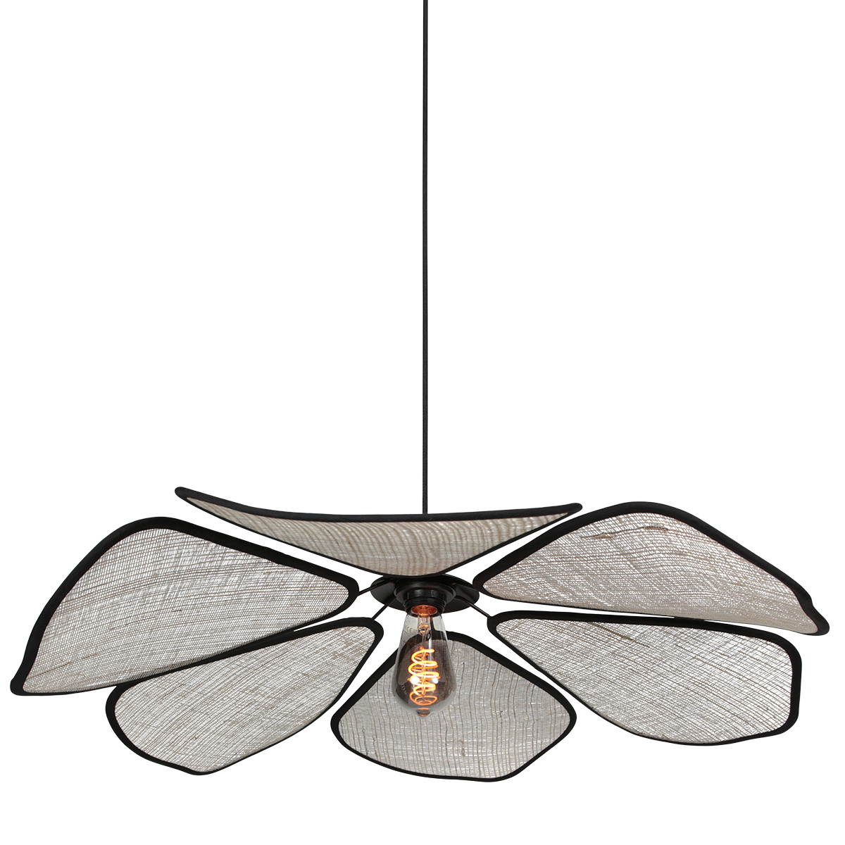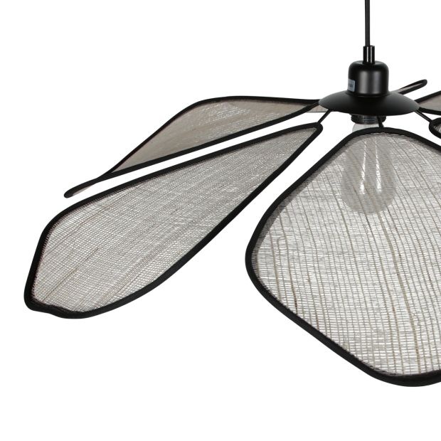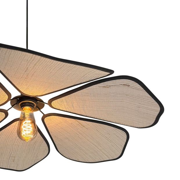 De lamp bestaat uit zes zorgvuldig gevormde linnen “bladeren” rondom de lichtbron. Dit zorgt voor een uniek lichtspel dat direct warmte en rust brengt in de ruimte.