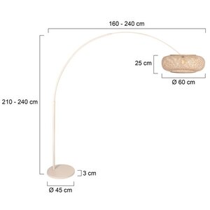 Deze crème booglamp is niet alleen een lust voor het oog, maar ook zeer praktisch. De arm van de lamp is verstelbaar, waardoor je de lichtbron eenvoudig boven je bank, fauteuil of eettafel plaatst. Ideaal als leeslamp of om een specifiek deel van de kamer subtiel uit te lichten. Met een diameter van 60 cm is de bamboe kap groot genoeg om een statement te maken, zonder te overheersen.