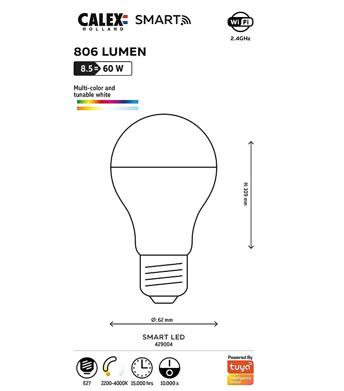 Calex Smart RGB+CCT E27 LED Lamp Dimbaar 8.5Watt