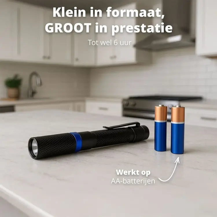 De Pen Flashlight werkt op 2 AAA-batterijen (niet inbegrepen), waardoor je nooit hoeft te wachten op opladen. Batterijen zijn overal makkelijk verkrijgbaar, perfect tijdens noodsituaties, survivaltrips of op momenten dat je direct licht nodig hebt. De zaklamp blijft betrouwbaar functioneren tussen -10 °C en +40 °C.