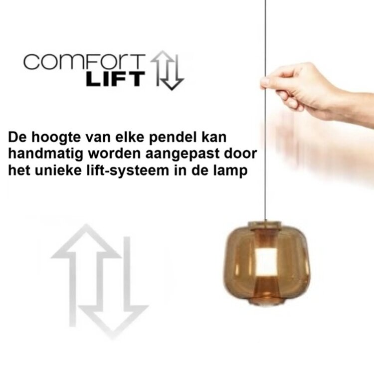 Altijd het juiste licht, op de juiste hoogte! De geïntegreerde Comfortlift maakt het mogelijk om de pendels elk moment soepel in hoogte te verstellen. Ideaal boven je eettafel of kookeiland.