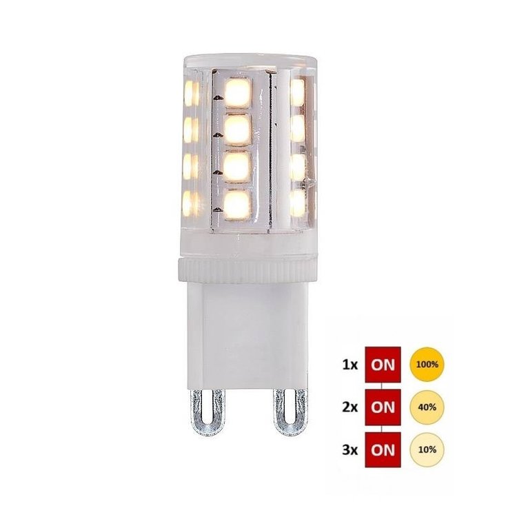 Deze LED lamp kan alle G9 fitting halogeenlampen vervangen. Deze Led-lamp geeft een mooie warme licht kleur en is uitgevoerd met een 3 standendimmer. Bespaar tot wel 80% op uw energieverbruik.