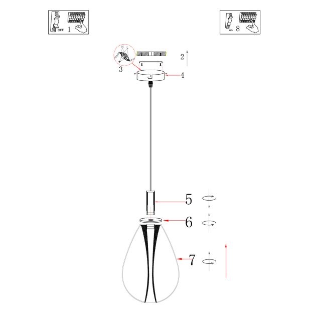 Elke kap bevat een vervangbare 6W LED-module die 580 lumen aan warm wit licht (2700K) verspreidt. In elk druppelvormig glas zit een witte cilinder, die het licht subtiel naar beneden richt – ideaal voor een zachte, gerichte lichtbundel zonder verblinding.