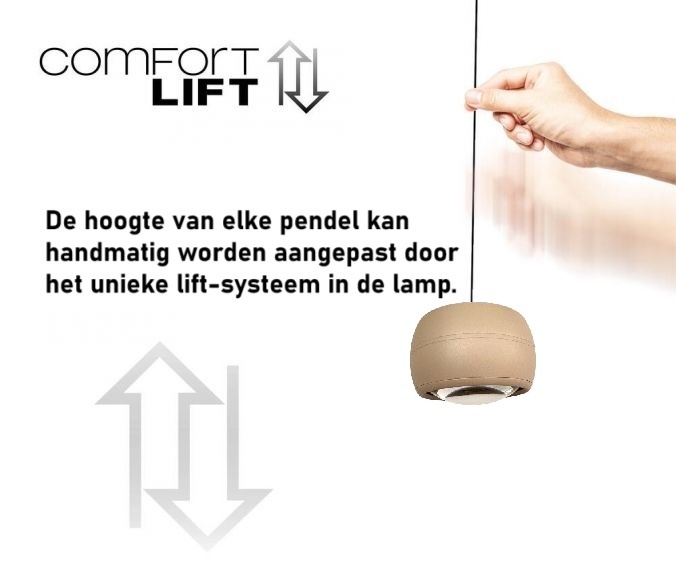 Altijd het juiste licht, op de juiste hoogte! De geïntegreerde Comfortlift maakt het mogelijk om de pendels soepel in hoogte te verstellen. Ideaal boven je eettafel of keukeneiland: hoger tijdens het koken, lager tijdens een gezellig diner.