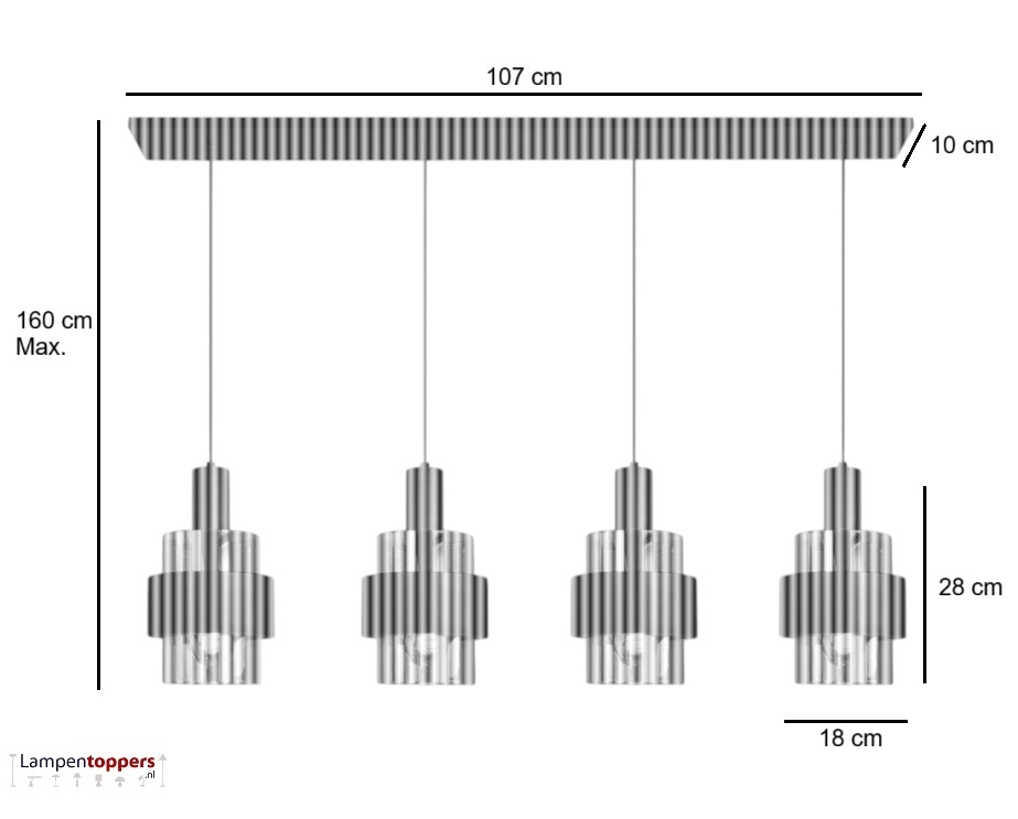 Het armatuur bestaat uit een langwerpige plafondplaat van 107 x 10 cm met vier elegante pendels.