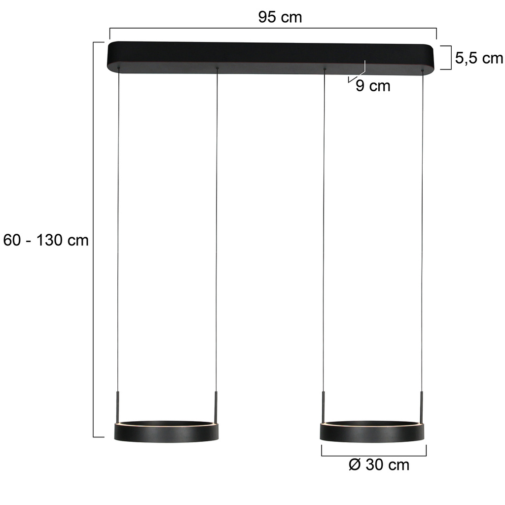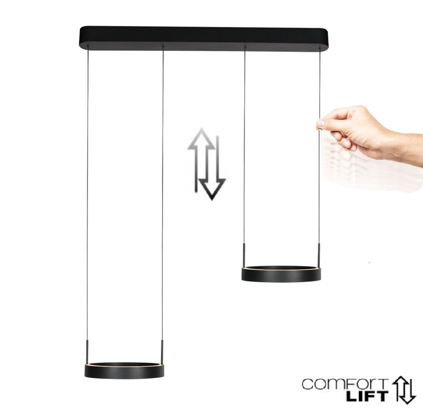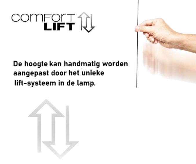 Met de geïntegreerde Comfortlift techniek stel je beide cirkels eenvoudig afzonderlijk in hoogte af. Zo creëer je zelf het ideale lichtbeeld voor jouw ruimte. De lamp is daarnaast volledig dimbaar via een externe dimmer, zodat jij de juiste sfeer bepaalt – van functioneel werklicht tot warm en gezellig dinerlicht.