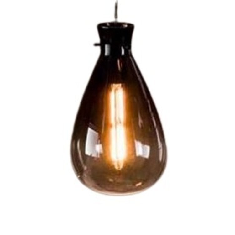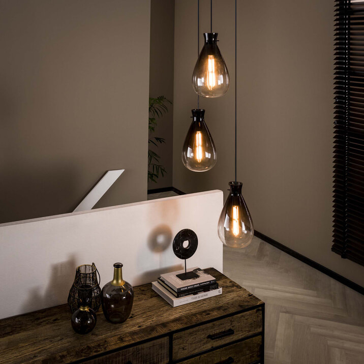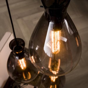 Een hanglamp die gezien mag worden! Deze speelse hanglamp heeft drie glazen van 18 centimeter doorsnee en zijn 30 centimeter hoog. De plafondplaat heeft een diameter van 28 centimeter. De glazen lopen van smokey uit tot helder wat een prachtig effect geeft. De plafondplaat is zwart van kleur.