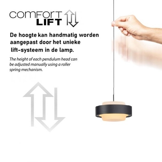 Dankzij het ingebouwde Comfort Lift-systeem stel je de hoogte van de kappen eenvoudig met de hand in van 20 tot 150 cm. Het snoer rolt soepel op en af in de plafondplaat, zodat je de lamp moeiteloos op de juiste hoogte hangt. Perfect voor boven een eettafel, kookeiland of werkblad.