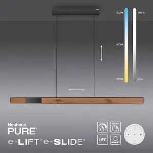 Perfecte vorm, perfect oppervlak, perfecte functie - de zwarte met houte LED hanglamp PURE-MOTO-RISE overtuigt door functionele perfectie en laat niets te wensen over. De esthetische hanglamp heeft een e-SLIDE® en e-LIFT® gemotoriseerde aandrijving. Deze functies maken elektrische hoogteverstelling en elektrische lengteverstelling mogelijk.