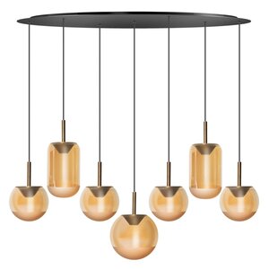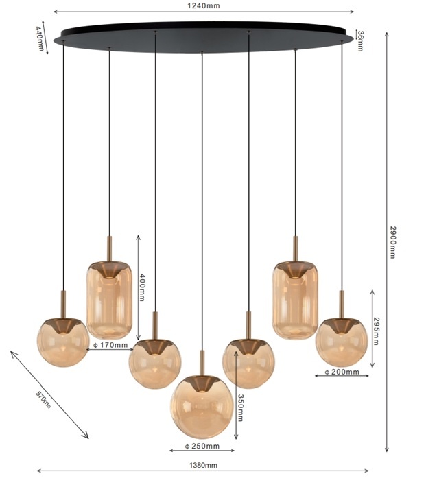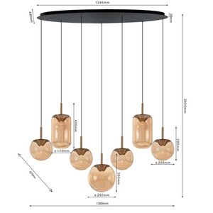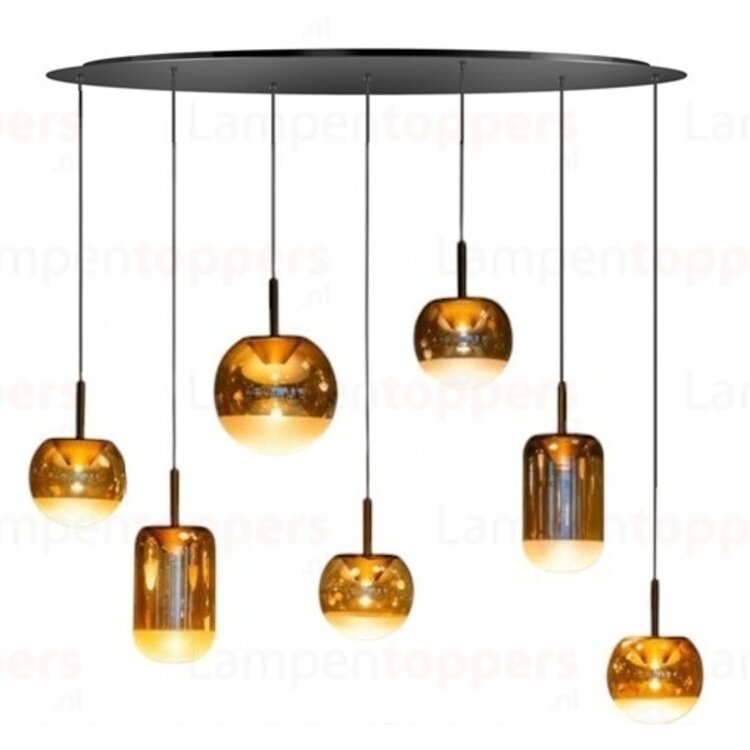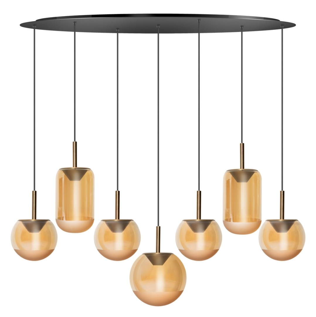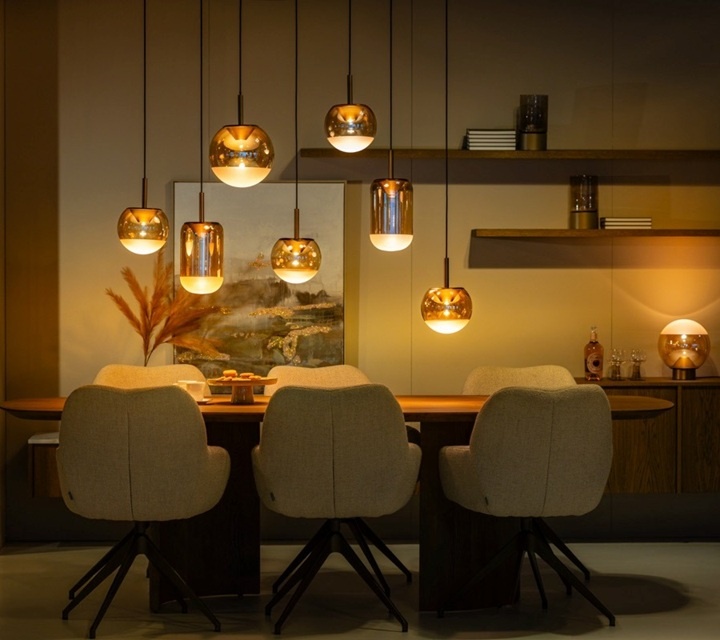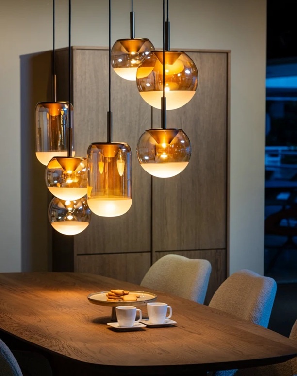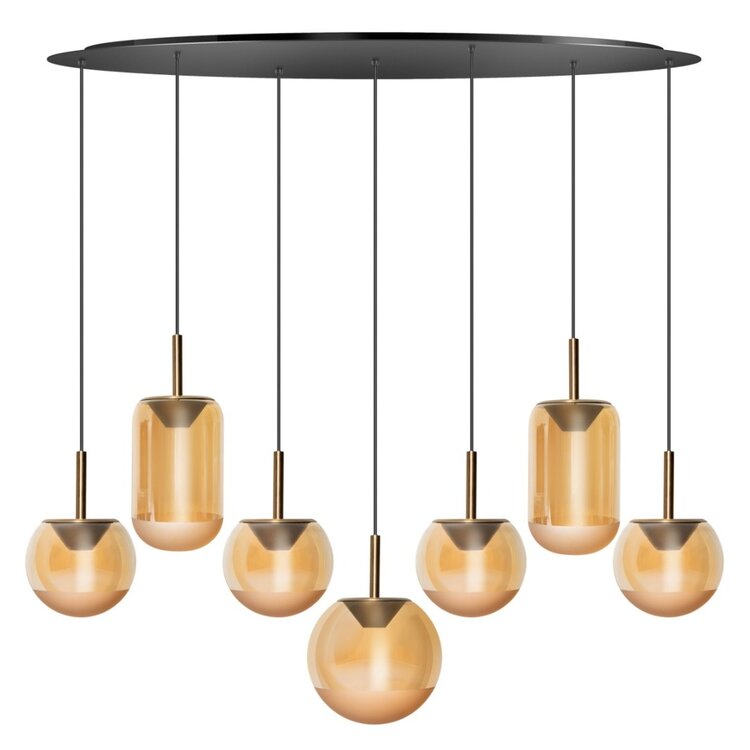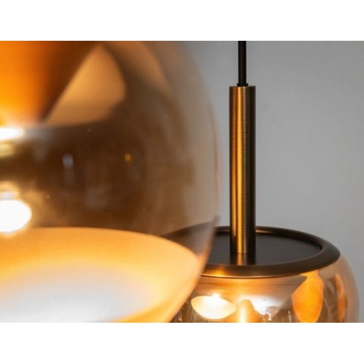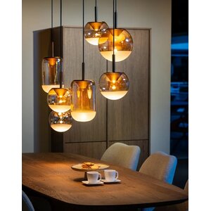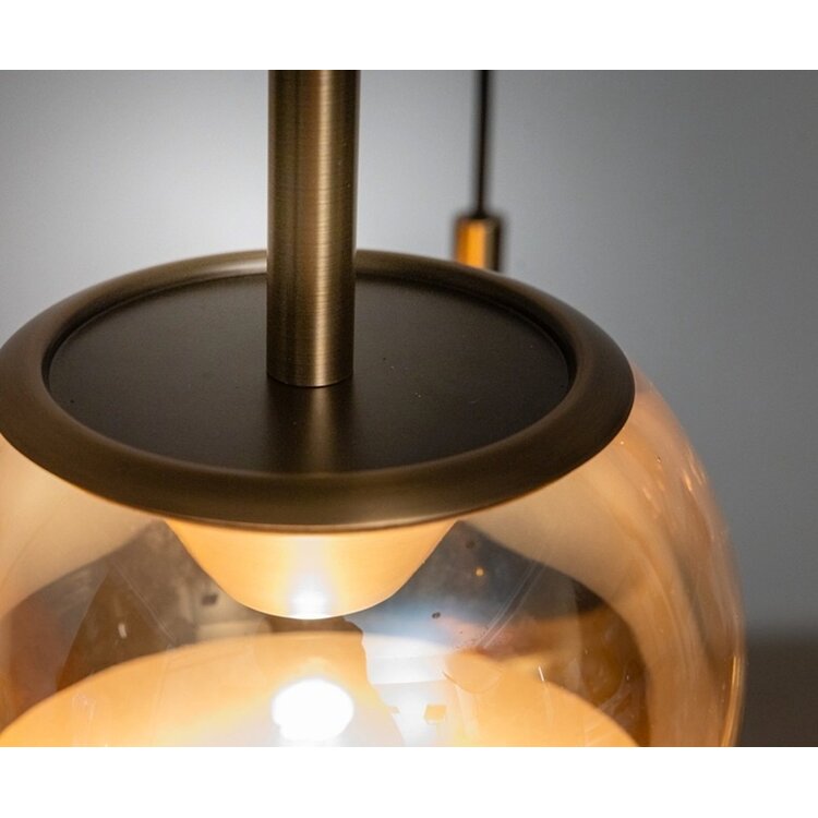 De Yvonne combineert zeven amberkleurige glazen in drie verschillende vormen: twee afgeronde rechthoekige bollen, vier kleine globes en één grote globe. Deze speelse mix zorgt voor een luxe, gelaagd effect zonder druk te worden. De onderzijde van het glas is mat gecoat, waardoor het licht zacht en diffuus wordt verspreid en nooit verblindt.