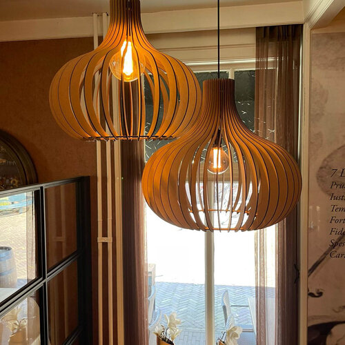 - Sculpturale lampen: een trend voor 2025 zijn houten hanglampen als speels en opvallend designobject, met bijvoorbeeld asymmetrische of gelaagde vormen die zowel decoratief als functioneel zijn.