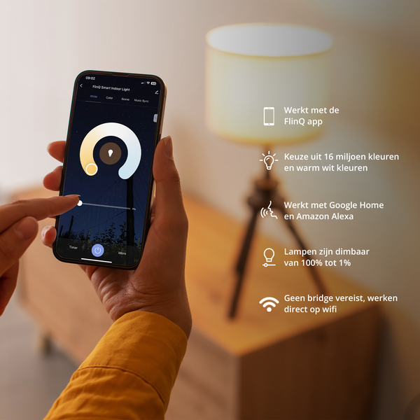 Met de app kun je de slimme lampen in elke kamer van je huis bedienen. Voeg al je slimme lampen toe en bedien ze allemaal eenvoudig met je smartphone of tablet. De FlinQ App is verkrijgbaar in de App Store of Google Play Store.