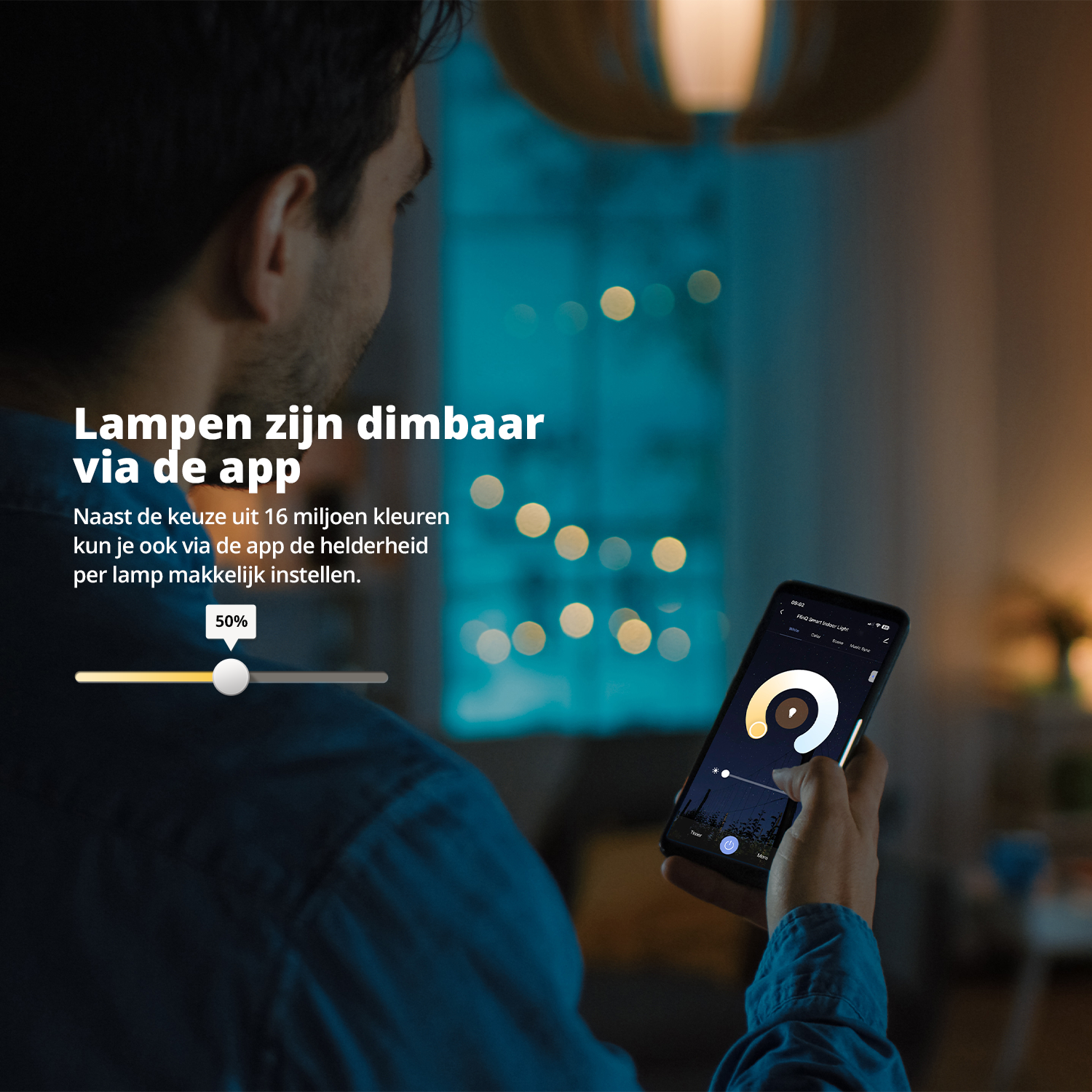Transformeer je huis met meer dan 16 miljoen kleuren en creëer onmiddellijk de juiste sfeer voor elke gebeurtenis. Met een tik op een knop verhoog je de feeststemming op een feest, verander je je woonkamer in een filmzaal, breng je de inrichting van je huis tot leven met kleuraccenten en nog veel meer.