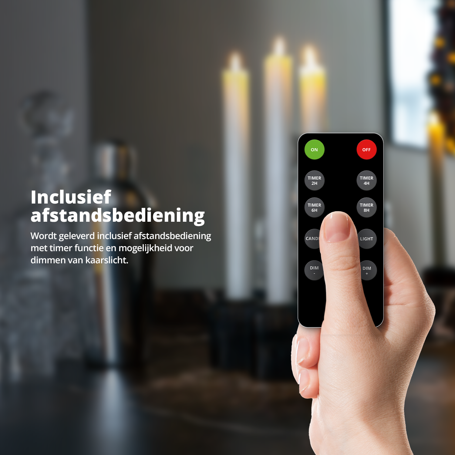 Deze led kaarsen set bedien je makkelijk en snel via de meegeleverde afstandsbediening. Je zet de kaarsen daarmee niet alleen AAN en UIT, maar kan ook kiezen voor het instellen van een timer, de helderheid van het licht bepalen of een gezellige flikkermodus aanklikken. De timermodus kan worden ingesteld met een tijdsspanne van 2 uur, 4uur, 6 uur of 8 uur.