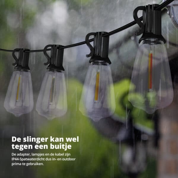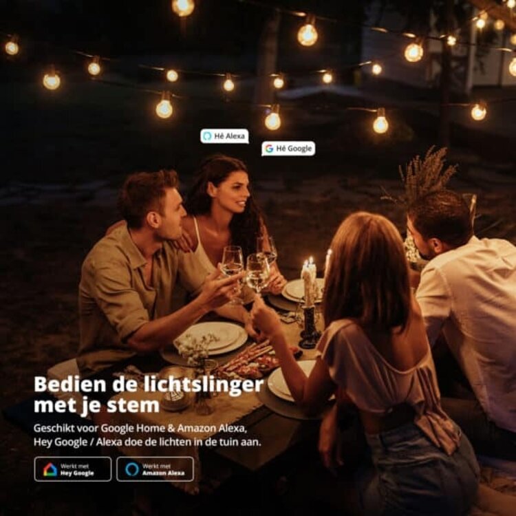 Deze lichtslinger is voorzien van unieke Filament RGB/WW LED lampen die zowel warm wit als kleurenlicht verspreidt, wat hem onderscheidt van andere lichtslingers. Koppel de slinger met Spotify om de lampjes synchroon te laten bewegen op de beat van je favoriete muziek. Met spraakbediening via Google Home of Alexa pas je eenvoudig de verlichting aan voor een gepersonaliseerde ervaring in elke ruimte.