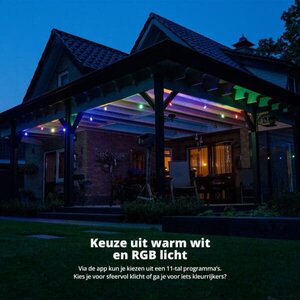 Met de mogelijkheid om te kiezen tussen warm wit of RGB-lichtkleuren, biedt deze slimme lichtslinger veelzijdigheid voor elke sfeer. Of je nu een gezellige, warme gloed wilt voor een ontspannen avond of kleurrijke verlichting voor een feest, deze lichtslinger past zich aan jouw wensen aan.