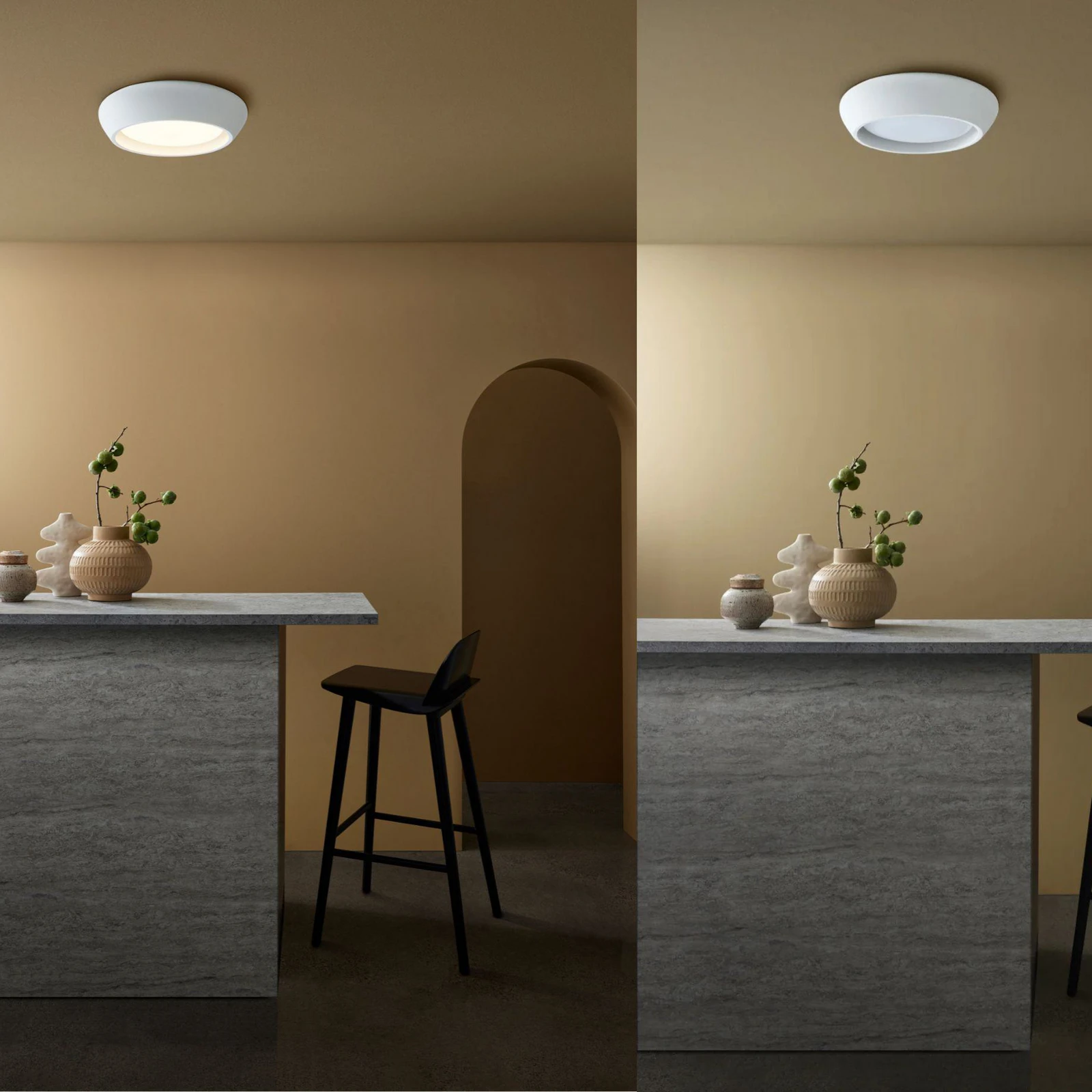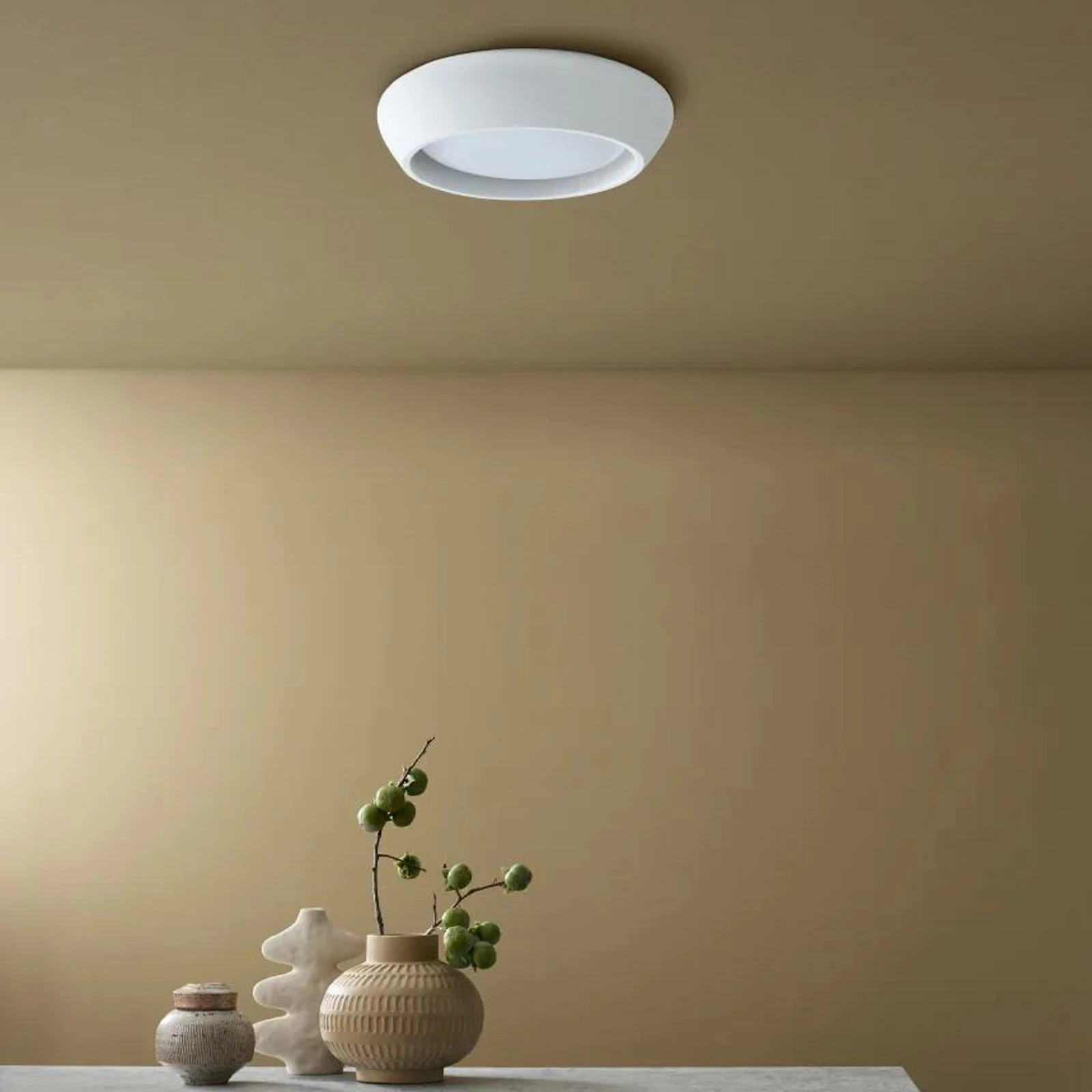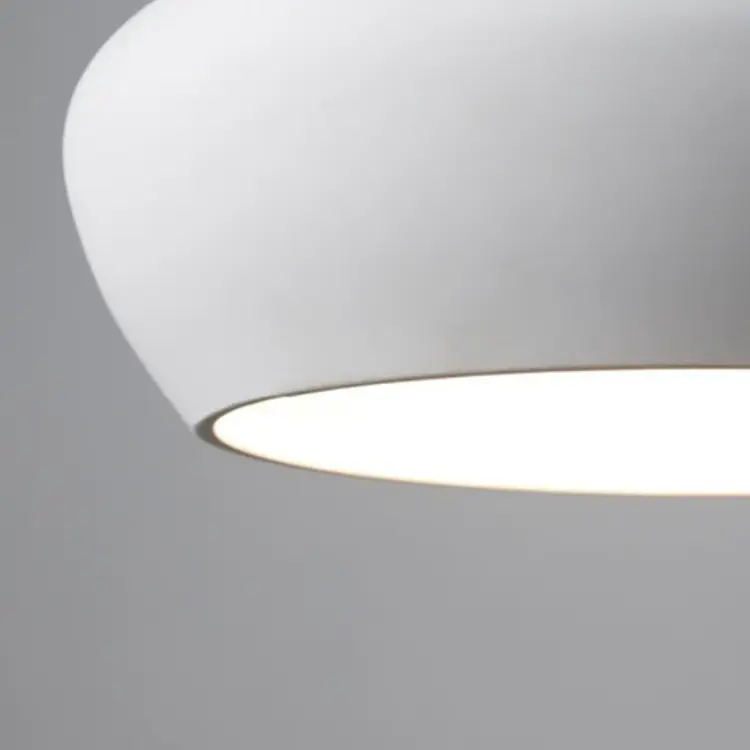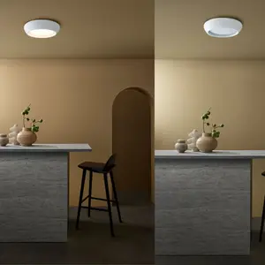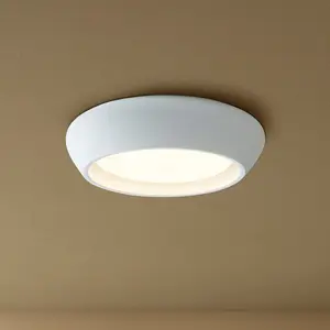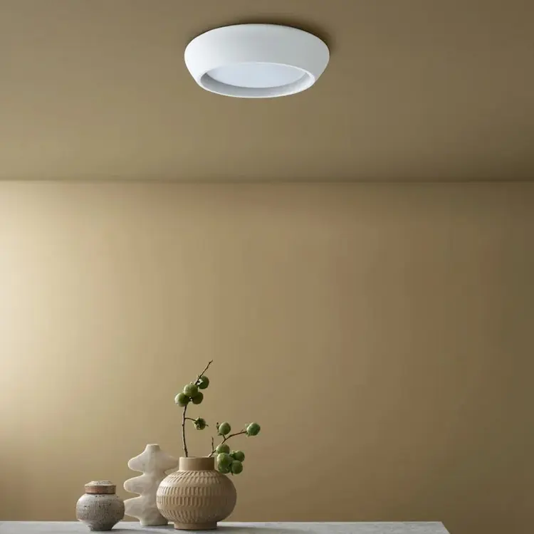 Dankzij het flush mount ontwerp sluit de lamp strak aan tegen het plafond, waardoor hij ideaal is voor ruimtes met lage plafonds. De zachte, matte afwerking in gips of beton zorgt voor een rustige en tijdloze uitstraling die past binnen moderne, Scandinavische en natuurlijke interieurs.
