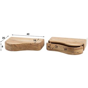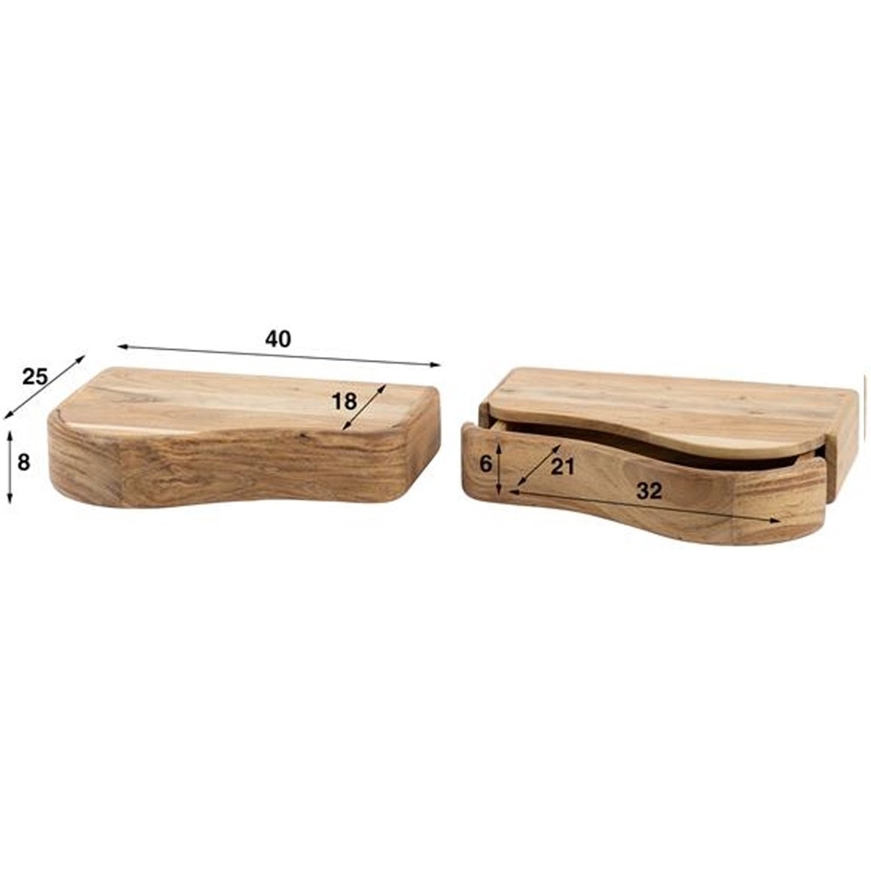 Het zwevende nachtkastje Organic combineert natuurlijke materialen met een verfijnd, functioneel ontwerp. Deze set van twee is gemaakt van massief acaciahout en afgewerkt met een matte, transparante lak die de houtnerf subtiel naar voren brengt. Dit zorgt voor een warme, authentieke uitstraling die perfect past binnen een moderne of rustieke slaapkamer.
