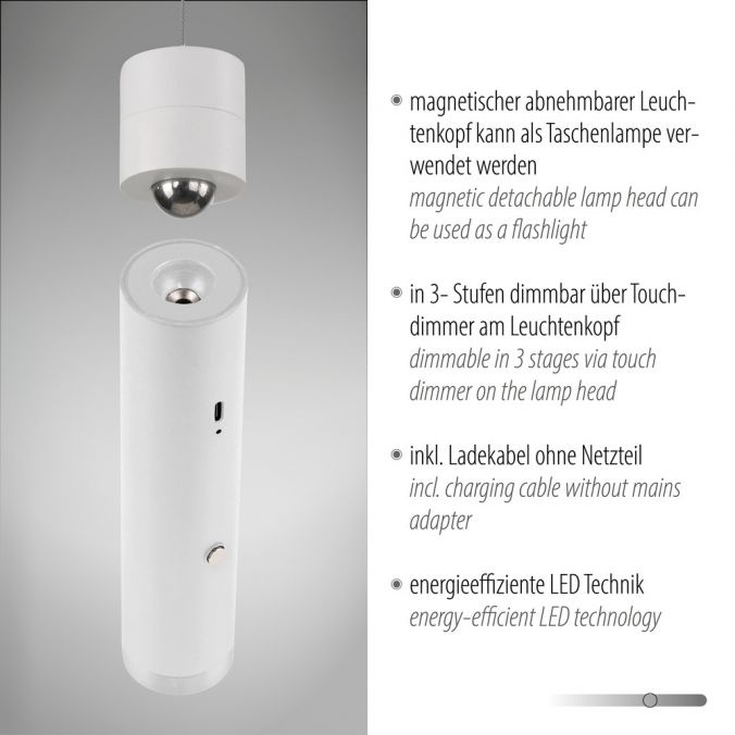 Oplaadbare Hanglamp Attach Wit incl. Dimmer USB-C Magneet Ø 4cm