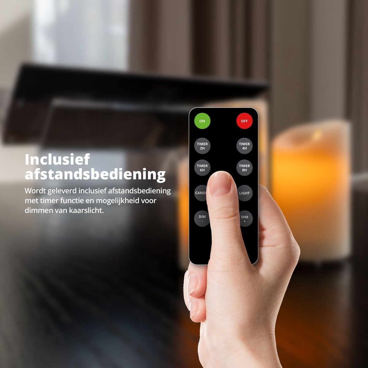 Deze kaarsenset bedien je makkelijk en snel via de meegeleverde afstandsbediening. Je zet de kaarsen daarmee niet alleen AAN en UIT, maar kan ook kiezen voor het instellen van een timer, de helderheid van het licht bepalen of een gezellige flikkermodus aanklikken. De timermodus kan worden ingesteld met een tijdsspanne van 2H,4H, 6H of 8H.