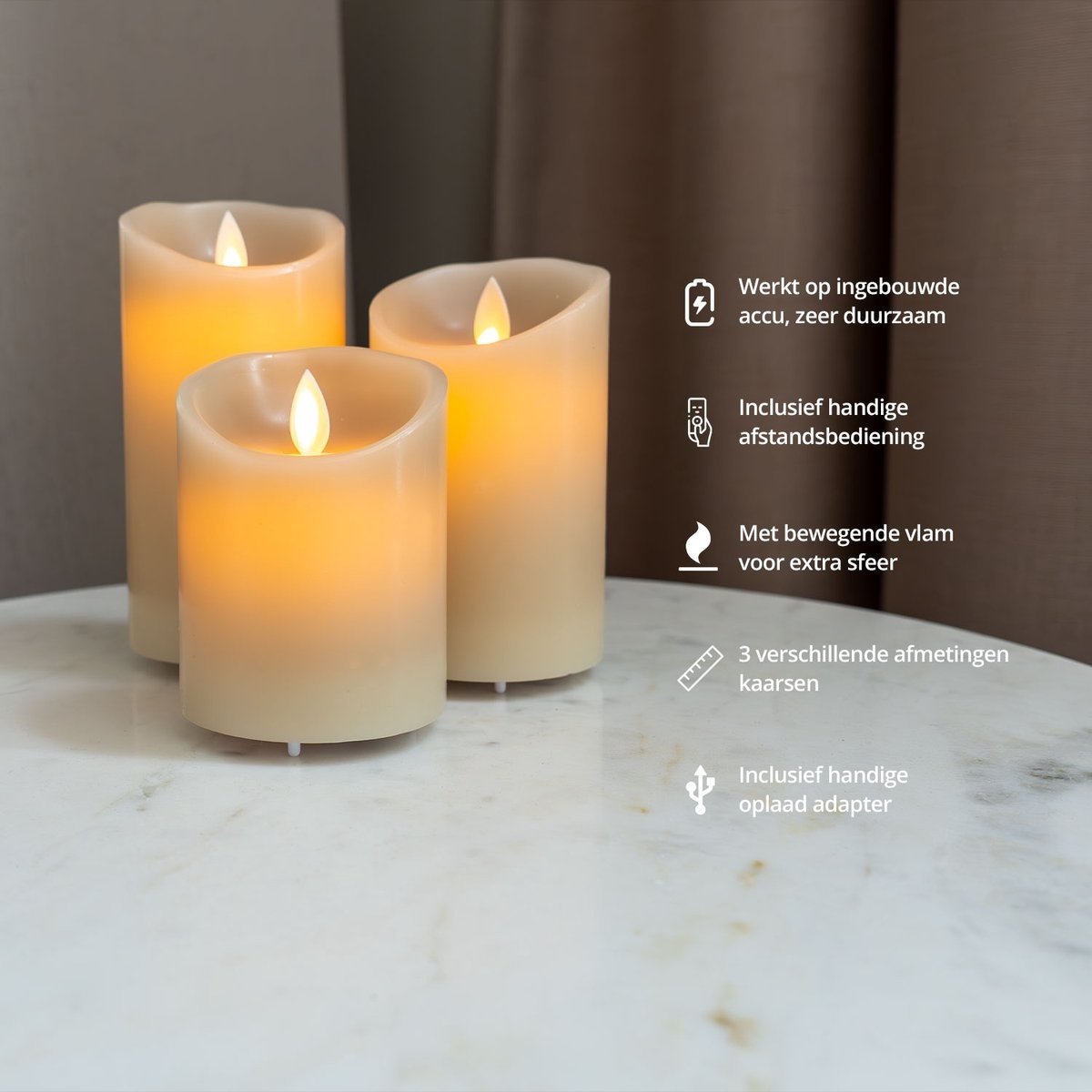 Hét voordeel van deze kaarsenset is dat de 3 kaarsen op te laden zijn met de meegeleverde usb-kabel. Je hoeft dus geen batterijen meer te vervangen. Een duurzame kaars dus!