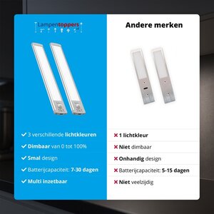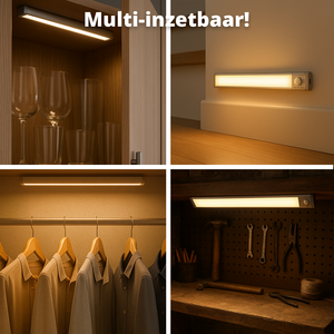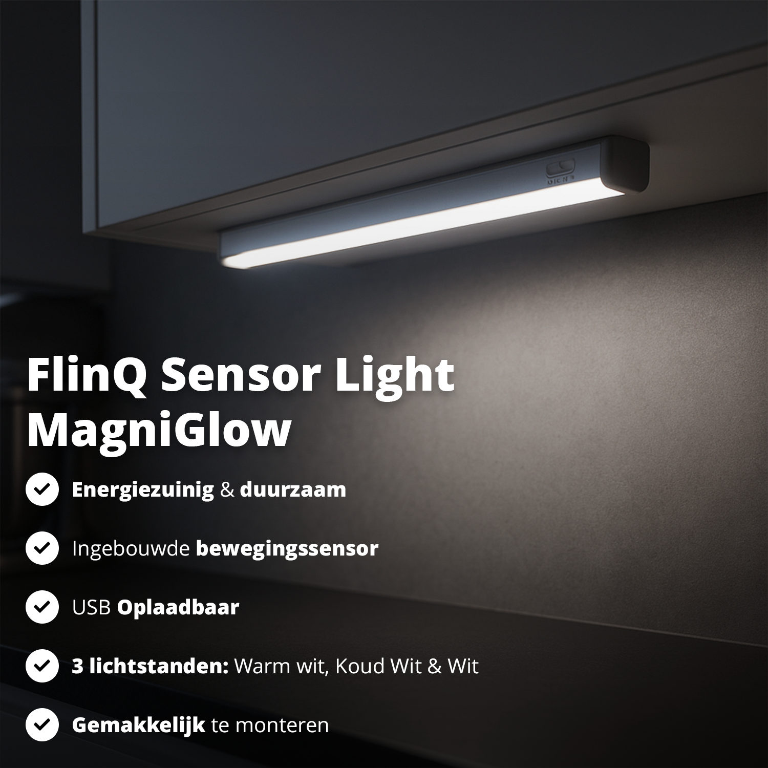 De FlinQ MagniGlow is een draadloze LED lichtbalk met ingebouwde bewegingssensor. Zodra er beweging wordt gedetecteerd binnen 3 meter en een hoek van 120°, springt het licht automatisch aan. Loop je weg? Dan schakelt de lamp vanzelf weer uit. Dat is niet alleen comfortabel, maar ook energiezuinig.