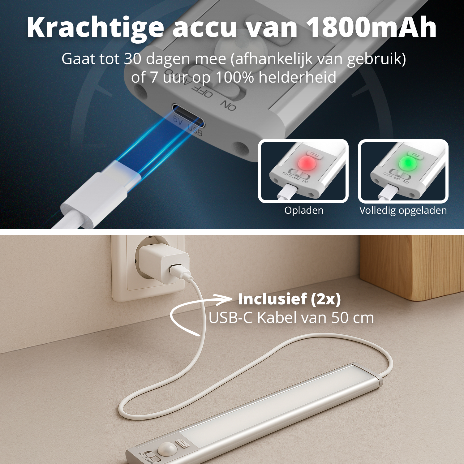 De geïntegreerde 1800mAh batterij is oplaadbaar via USB-C en gaat tot 30 dagen mee bij normaal gebruik. In constante modus brandt de lamp tot 7 uur non-stop op maximale helderheid. Opladen doe je eenvoudig met de meegeleverde USB-C kabels.