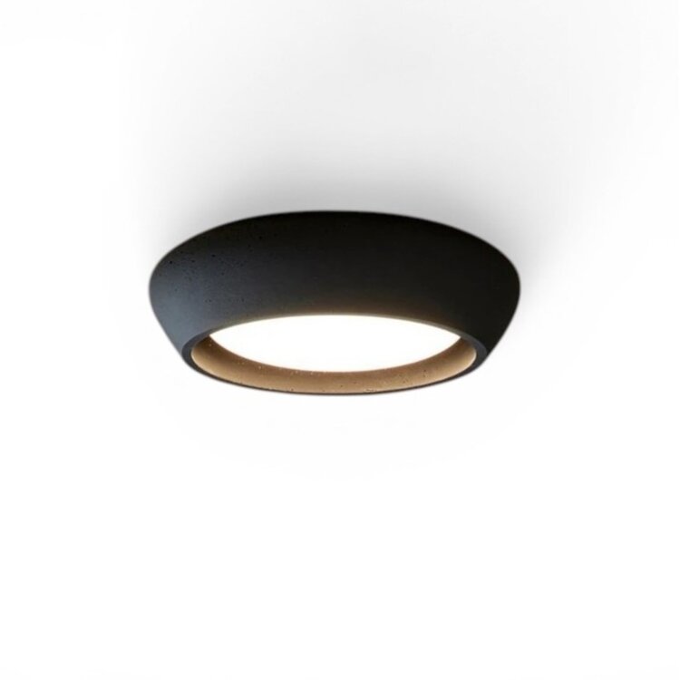 Dankzij het flush mount ontwerp sluit de lamp strak aan tegen het plafond, waardoor hij ideaal is voor ruimtes met lage plafonds. De zachte, matte afwerking in gips of beton zorgt voor een rustige en tijdloze uitstraling die past binnen moderne, Scandinavische en natuurlijke interieurs.