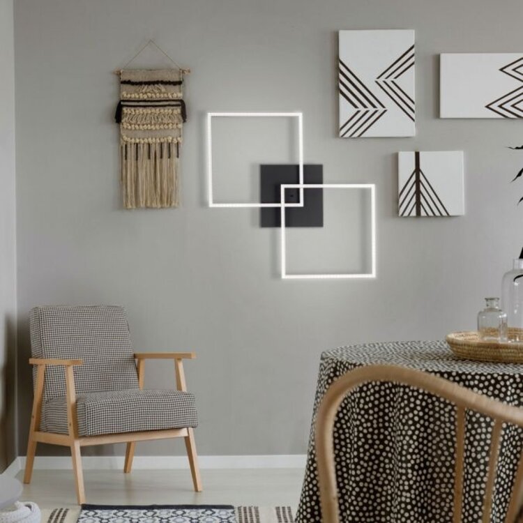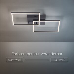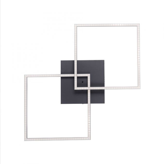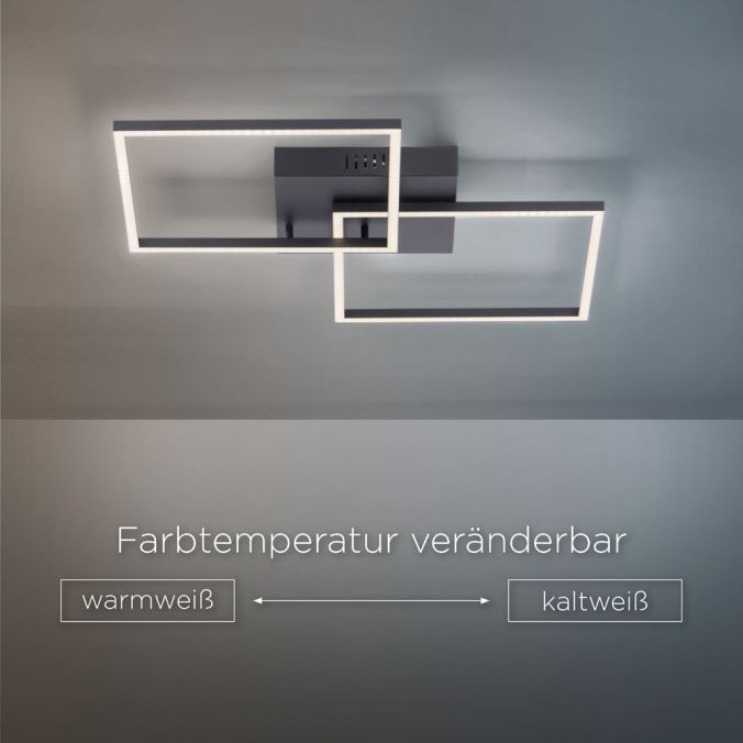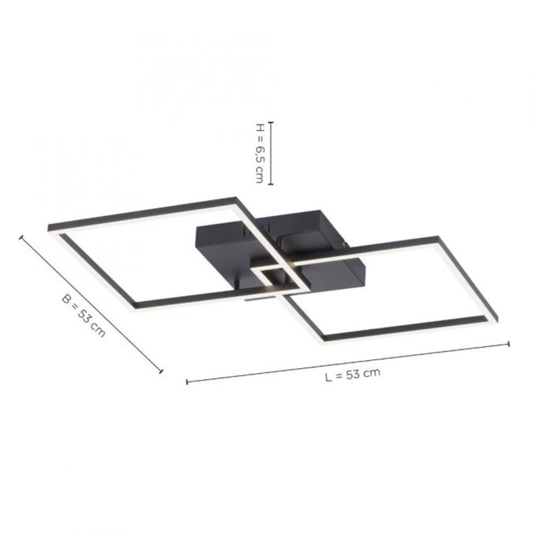 De zwarte LED plafondlamp overtuigt door haar moderne design. Met zijn twee overlappende vierkanten lijkt de platte lichtbron bijna onder het plafond te zweven. De plafonniere wordt geleverd met twee vast geïnstalleerde LED-lampen en een infrarood afstandsbediening.