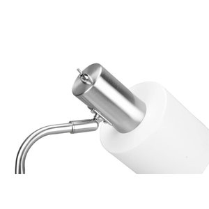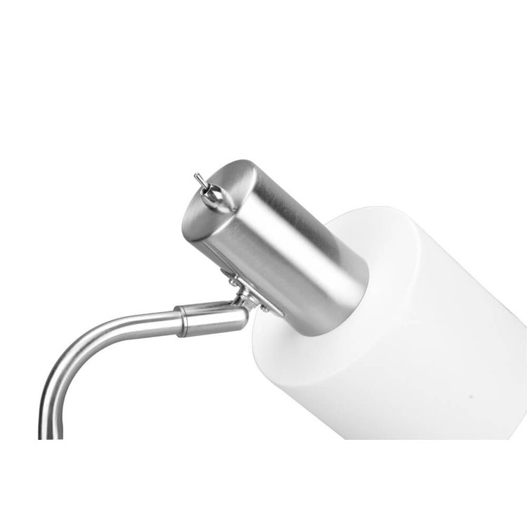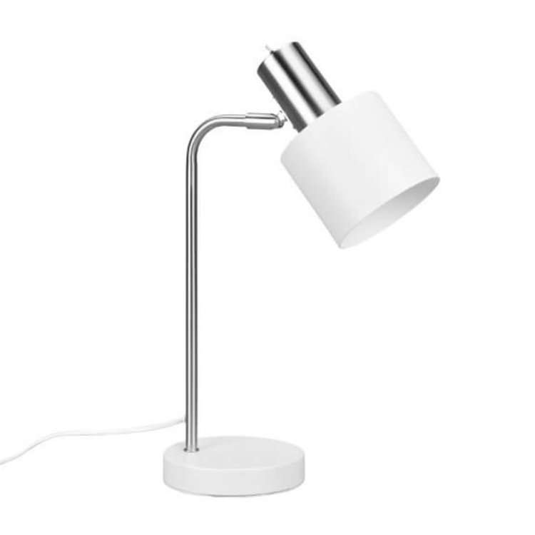 Deze tafellamp is uitgevoerd met een E14 fitting en heeft een handig tuimel schakelaartje op het lampenkapje. De Adam tafellamp is 43.5 centimeter hoog en 28 centimeter diep, de lamp is rvs en wit van kleur en heeft een wit snoer van 1.5 meter.