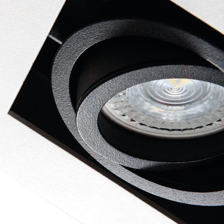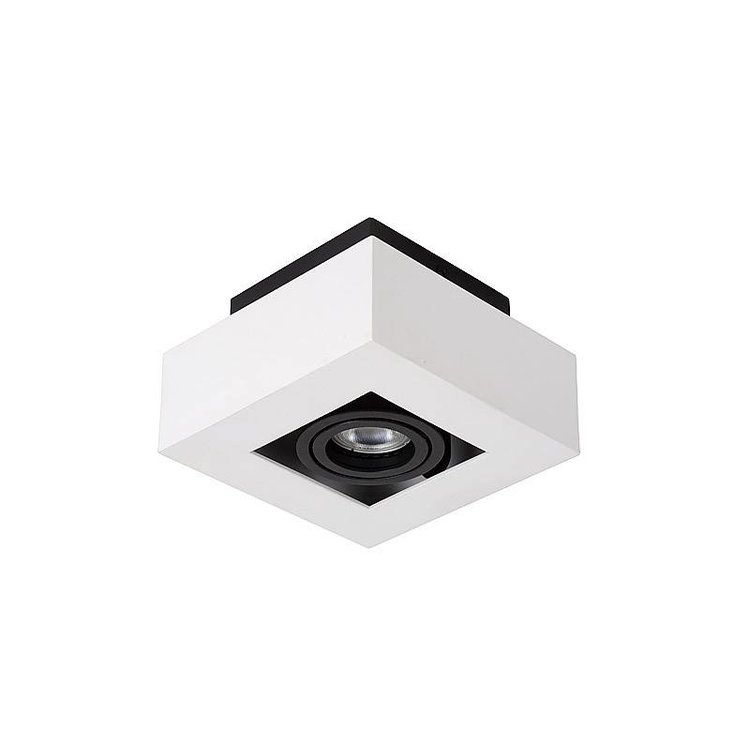 Stoere spot in de kleur wit in combinatie met zwart. De lamp wordt geleverd met een GU10 fitting hierdoor kan zelf het type lichtbron worden uitgekozen. Deze vierkante spot is kantelbaar.