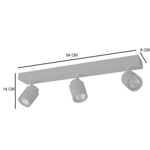 De cilinder van dit spotje heeft een doorsnede van 6.5 centimeter. De plafondplaat is 8 x 54 centimeter en de lamp is maximaal 14 centimeter hoog.