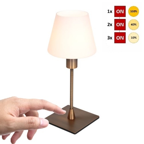 Bronzen tafellamp uit de Ancilla serie. Wordt geleverd met een opaal wit glas en is voorzien van een E14 (kleine) fitting. Geschikt voor lichtbronnen tot 40 Watt, deze wordt niet mee geleverd. De bediening van de lamp gaat door middel van het aanraken van het metalen gedeelte van de lamp.
