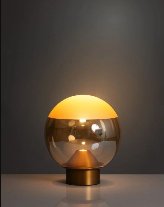 De Yvonne tafellamp valt op door de combinatie van een strakke metalen voet en een amberkleurige glazen kap. Dit warme glas verzacht het licht en voorkomt verblinding, waardoor er een rustige en luxe gloed ontstaat. Ideaal voor ontspannen avonden of als subtiele accentverlichting.