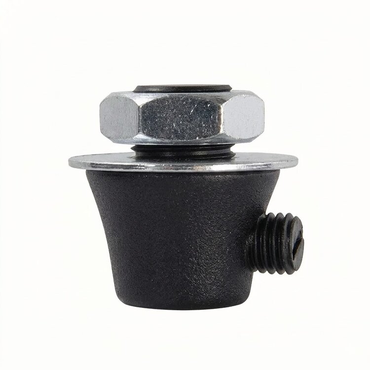 Zwarte taps toelopende trekontlaster om te monteren aan een plafondplaat of plafondbalk. Gemaakt van kunststof boutje. Aan het M10 draadend bevindt zich een M10 moer om de trekontlaster te monteren.