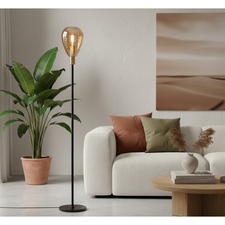 Deze Dorato vloerlamp is een echte blikvanger voor in uw interieur! De combinatie van zwart, goud & amber-kleurige glas maakt dit dé eyecatcher!