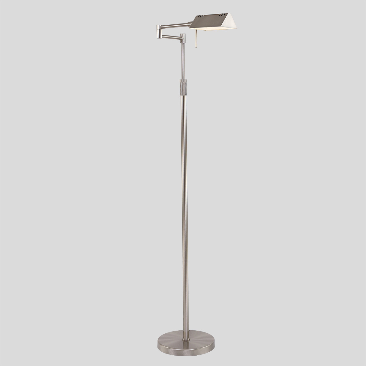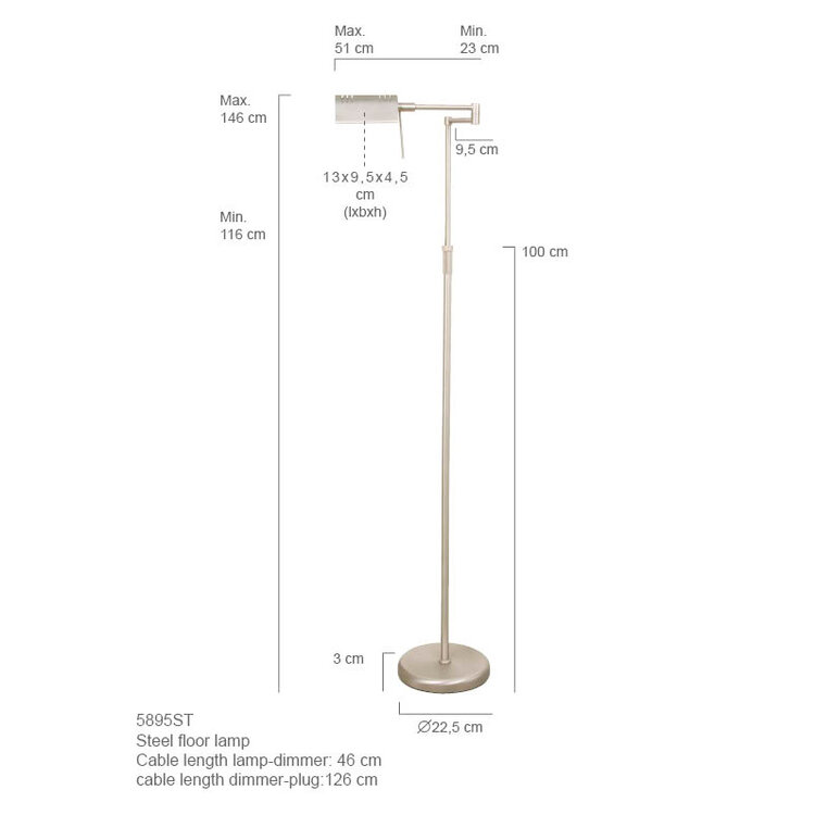 Een vloerlamp met knikarm zodat het licht daar komt waar gewenst. Deze leeslamp wordt geleverd incl. 10 watt led. De vloerlamp is dimbaar dmv een traploze dimmer zodat iedere sfeer gecreëerd kan worden. Karl is in hoogte verstelbaar van 114 cm tot 146 cm