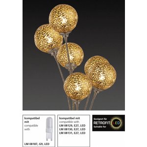 Een grote bos bloemen bijna. De zes ronde, goudachtige kogels zijn vakkundig gefreesd wat een een waanzinnig lichteffect geeft op de wanden en het plafond in de buurt van het armatuur. De metalen delen zijn donkerbruin, bewust geroest. Zie verder voor meer artikelen in deze serie. Dit armatuur heeft zes G9-fittingen maar worden de lichtbronnen er niet automatisch bijgeleverd.