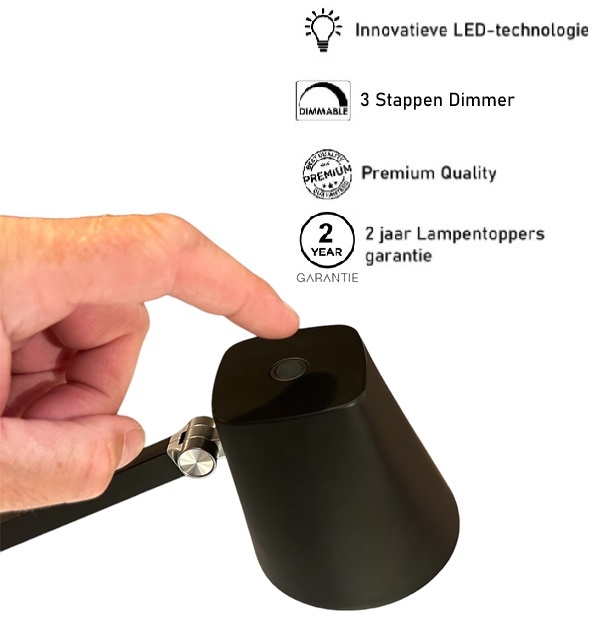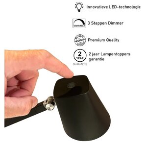 Wat deze lamp extra bijzonder maakt, is de ingebouwde 3-staps dimmer. Hiermee kunt u eenvoudig de lichtintensiteit aanpassen naar wens, of u nu sfeerverlichting wilt of juist helder licht nodig heeft om te lezen of te werken. Met één druk op de knop schakelt u tussen de verschillende lichtstanden, wat zorgt voor een flexibele verlichtingservaring in elke ruimte.
