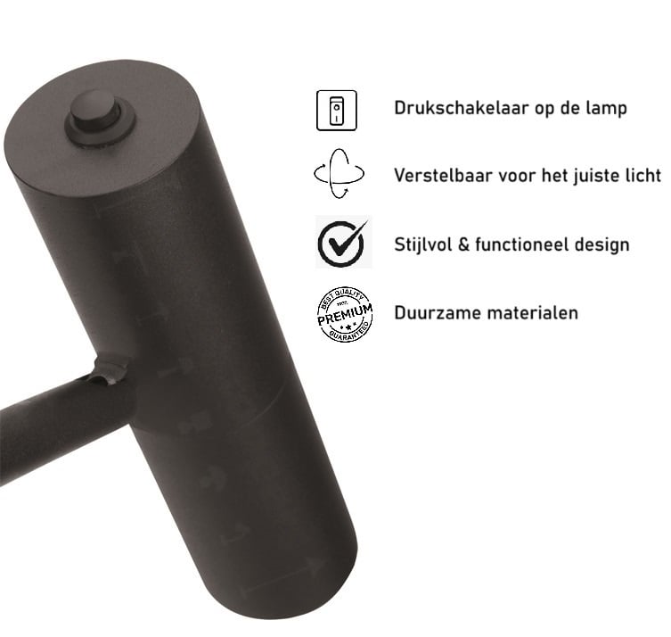 Een van de praktische kenmerken van deze leeslamp is de geïntegreerde drukschakelaar, handig geplaatst op het kapje van de lamp. Hierdoor is de lamp eenvoudig te bedienen zonder dat je hoeft te zoeken naar een schakelaar aan een snoer. Dit maakt de Freelight Undici niet alleen stijlvol, maar ook zeer gebruiksvriendelijk.