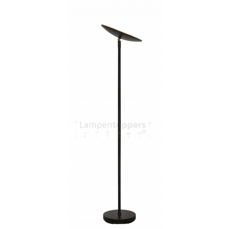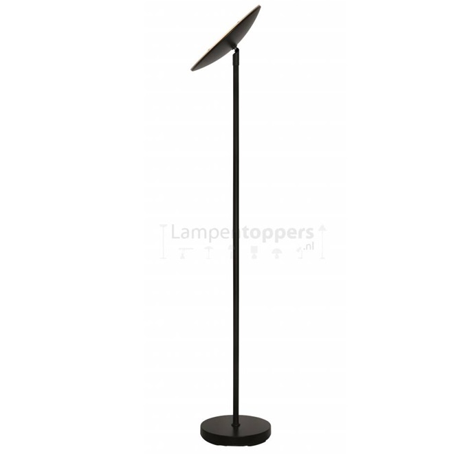 Een tijdloze vloerlamp in de kleur zwart met energiezuinige led verlichten en een vloerdimmer. De bovenschaal van deze uplighter is eenvoudig te kantelen hierdoor heb je altijd het licht op de juiste plek.