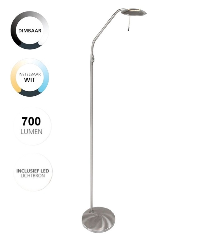 Staal kleurige vloerlamp uit de Zenith serie. De lamp is voorzien van een vervangbare LED module van 6 Watt met 700 Lumen. De vloerlamp is dimbaar en lichtkleur instelbaar van 2200 Kelvin, warm geel licht, tot 4000 Kelvin, fel wit licht.